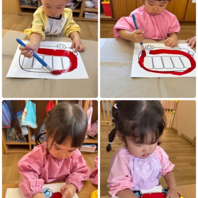 おべんとうバスの製作をしました! えのぐでバスの色を塗ったり、つぼみさんはお弁当の具材をのりで貼ったりしました♪ チューリップさんは両面テープをはがして自由に貼…