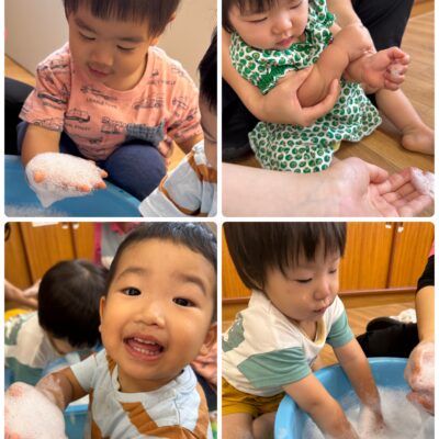 せっけん遊びをしました。 大きなタライの中に石鹸を削って入れ、勢いよく混ぜて泡を作りました! 「うわ〜(^O^)」と不思議そうに触る子や思い切りタライの中に手を…