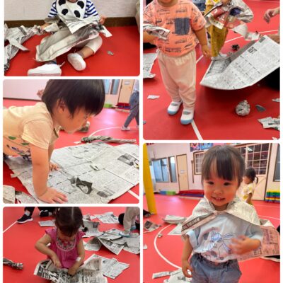 新聞遊びをしました。 ビリビリとやぶったり、丸めたり、アンパンマンのマントのように肩に巻いたりと色々な遊びをして楽しんでいました♪ 2人並んで「はいチーズ^_^…
