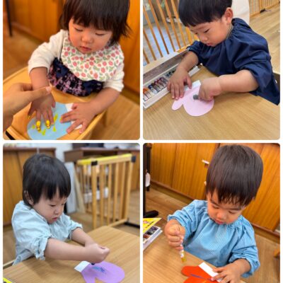 てぶくろの製作をしました。 ひよこさんは指スタンプ、チューリップさんはクレヨンでなぐり描きをしました♪ つぼみさんは、穴の中に毛糸を通しました。器用に指先を使っ…