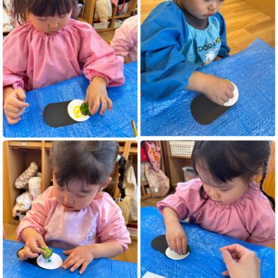 雪だるまの製作をしました。 つぼみさんは、白い紙をはさみで切って貼り絵をしました。 慎重に、集中して取り組んでいました。 チューリップさんはシール貼りをしました…